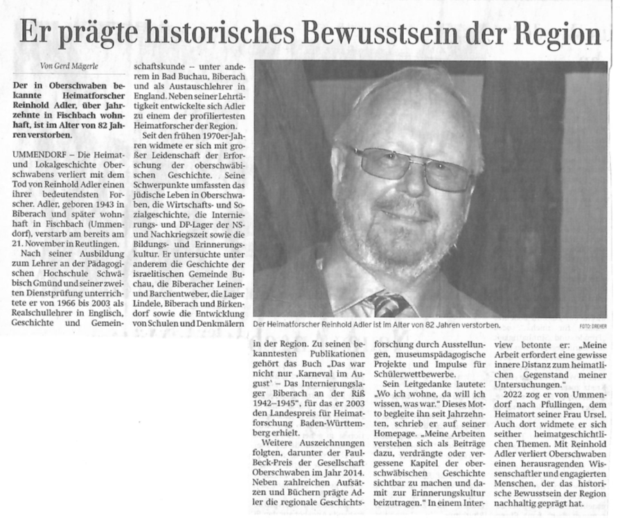 Reinhold Adler war seit Beginn der freundschaftlichen Beziehungen zu Guernsey Mitglied in unserem Freundeskreis. Er hat schon in den 80er Jahren als Lehrer an der Dollinger-Realschule mit Schülern die Geschichte des Lager Lindele aufgearbeitet. Danach hat ihn dieses Thema nicht mehr losgelassen. 2002 erschien sein Buch „Das war nicht nur „Karneval im August“, in dem er ausführlich über das Leben der Kanalinselbewohner berichtete, die dort von 1942 – 1945  interniert waren. Dieses Buch ist ein detailliertes Geschichtsdokument, das alles über das Lager Lindele enthält. 2003 erhielt Reinhold Adler dafür den Landespreis für Heimatforschung Baden-Württemberg.