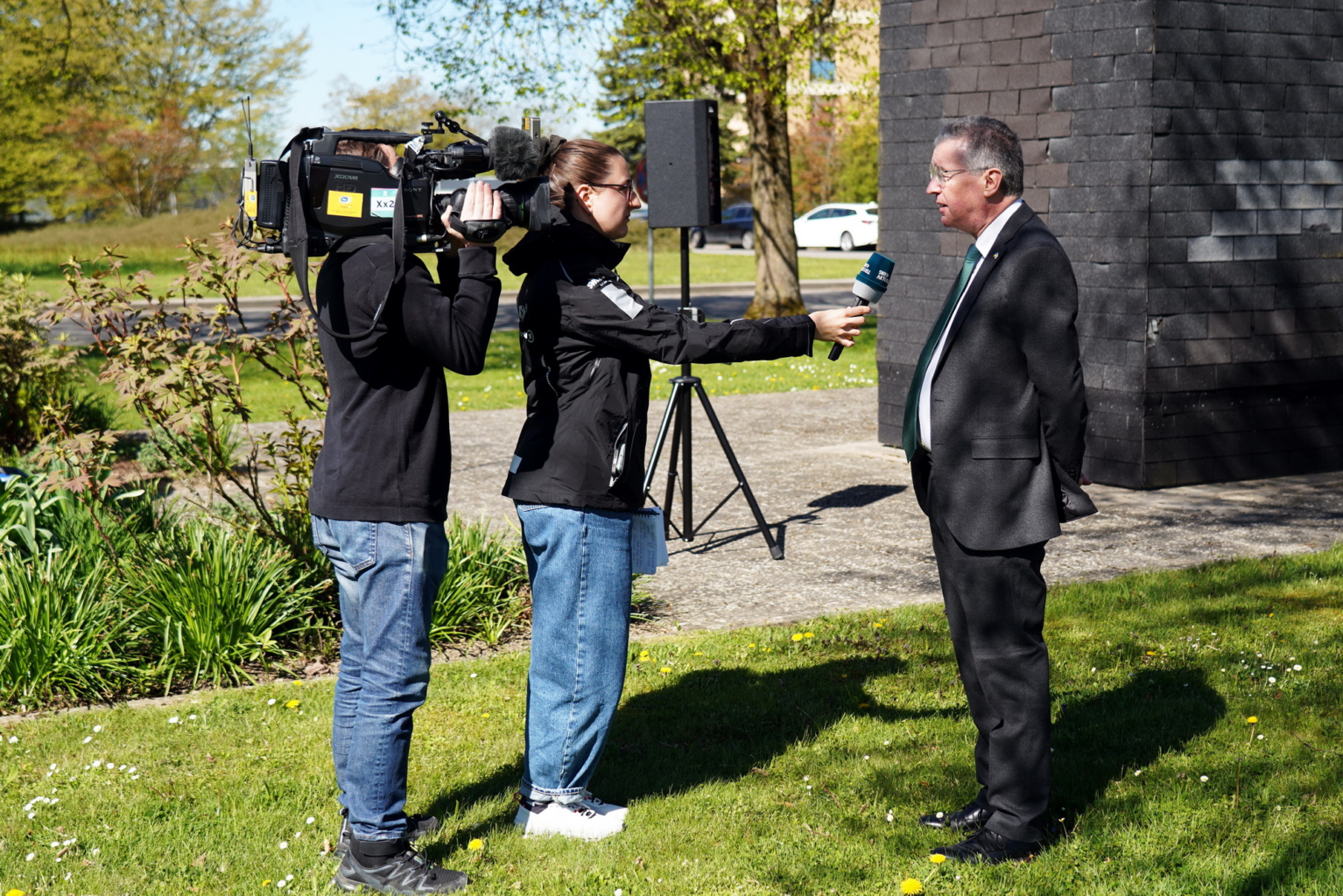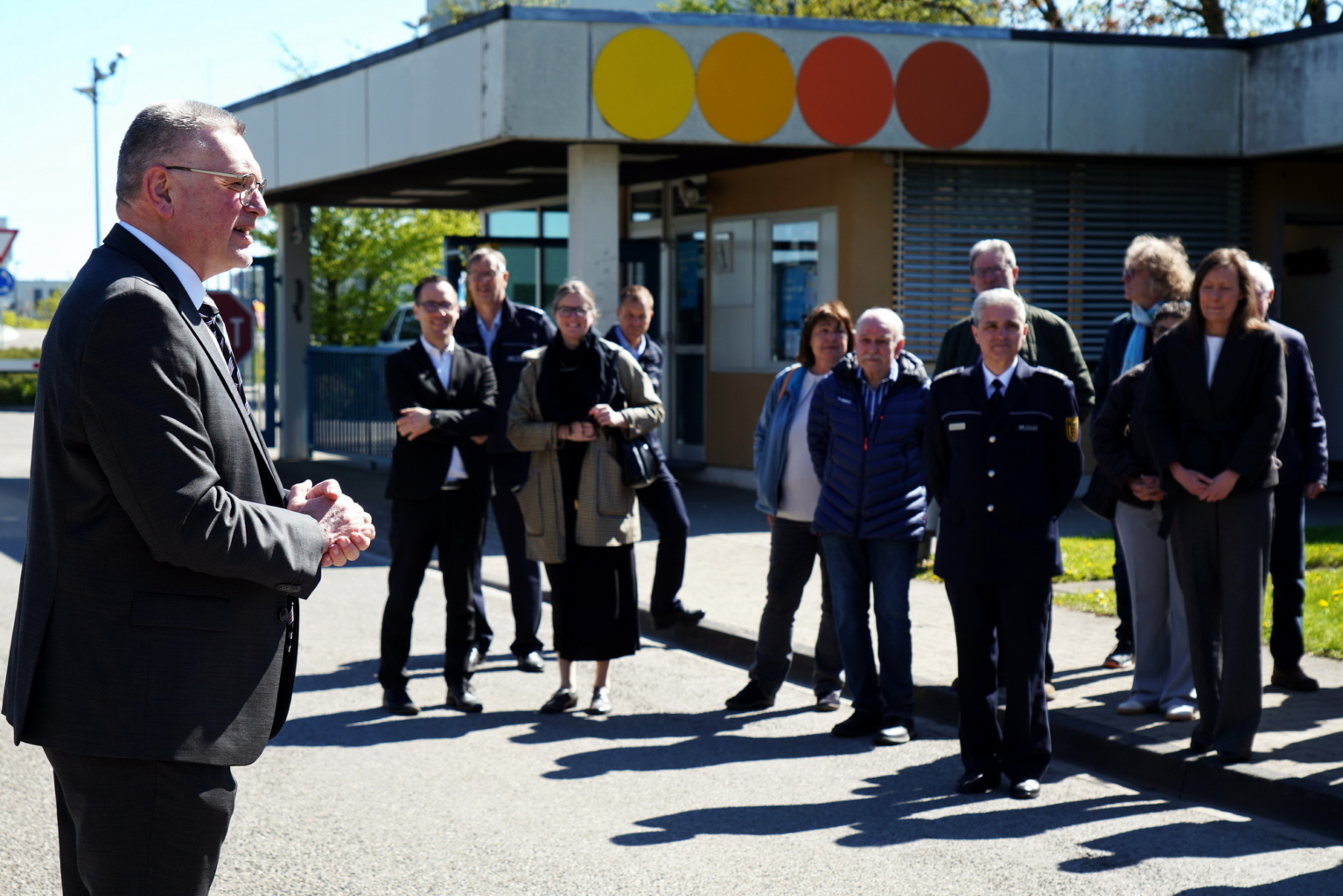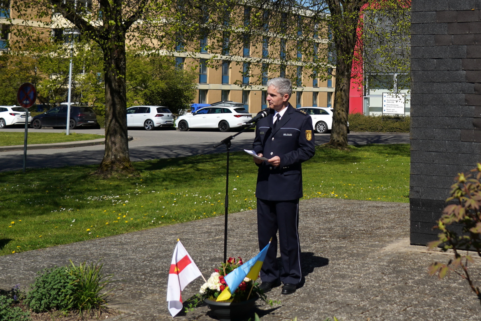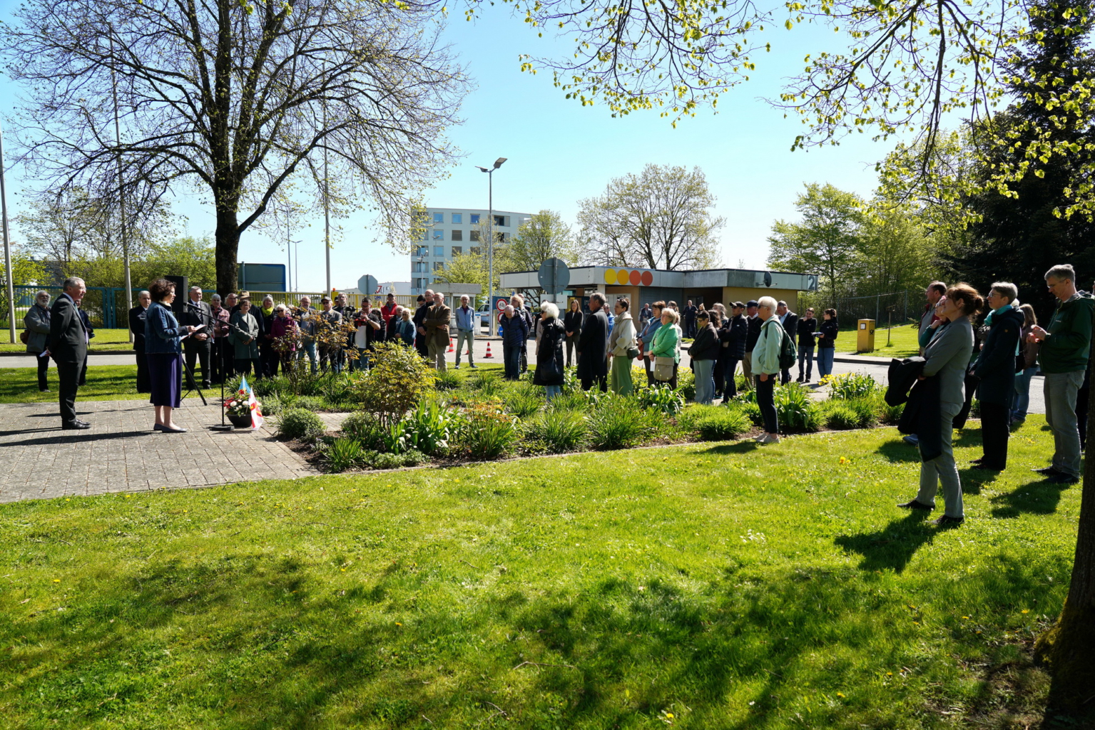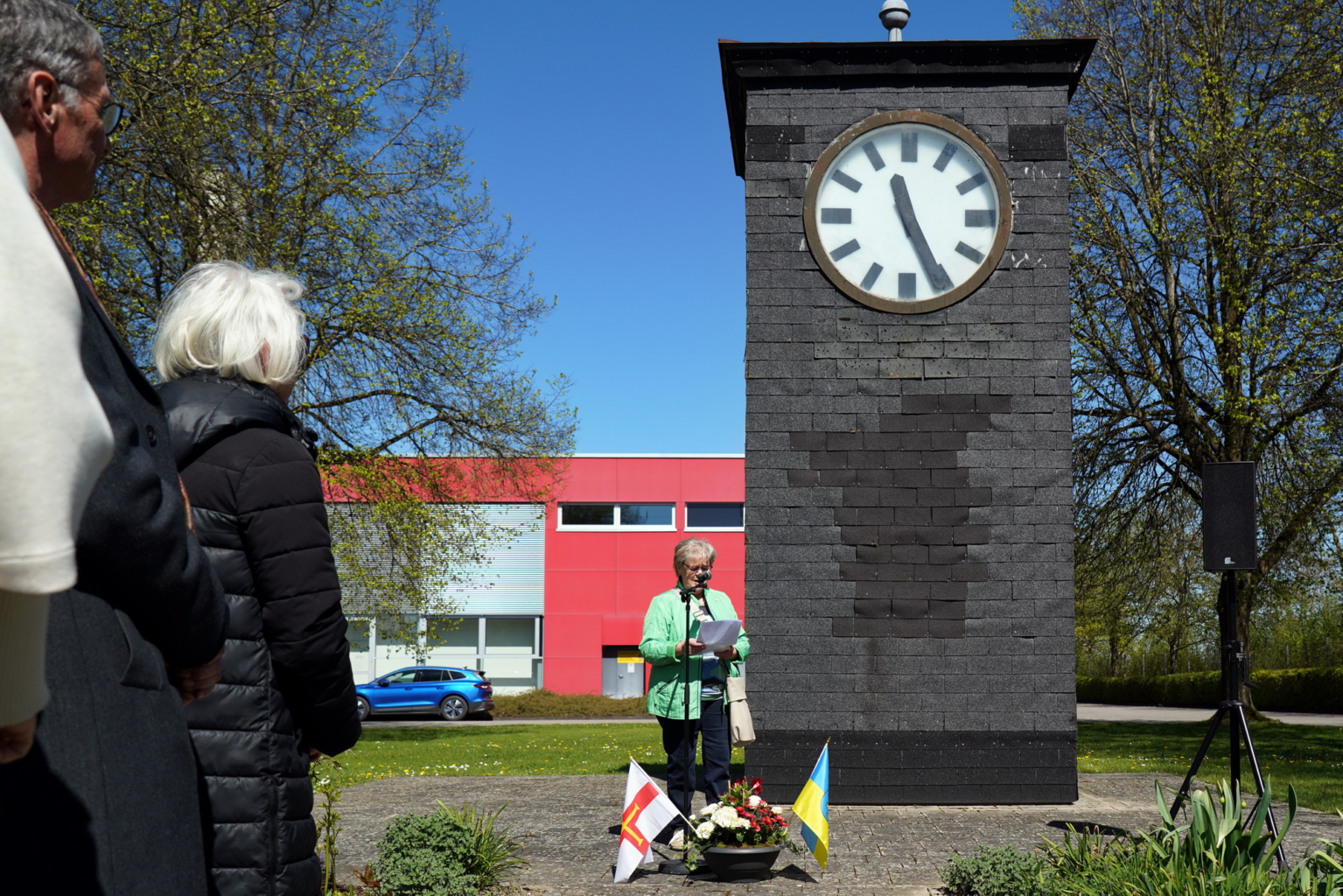 Im Anschluss wurde vor dem Uhrturm, dem einzigen noch erhaltenen Bauteils des damaligen Lagers Lindele, auf dem Gelände der Hochschule für Polizei der Menschen gedacht, die zwischen 1940 und 1945 im Lager Linde gefangen gehalten wurden, und die hier starben.
