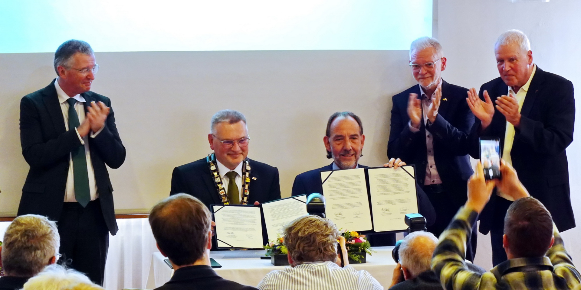 Am 81. Jahrestag des Befreiung des Lagers Lindele am St. George-Day, dem 23. April 1945, fand die feierliche Gegenunterzeichnung der Freundschafts-Rahmenvereinbarung zwischen den States of Guernsey und Biberach durch Deputy Steve Falla, Minister for External Relations Government of Guernsey, und Oberbürgermeister Norbert Zeidler im Biberacher Rathaus statt.