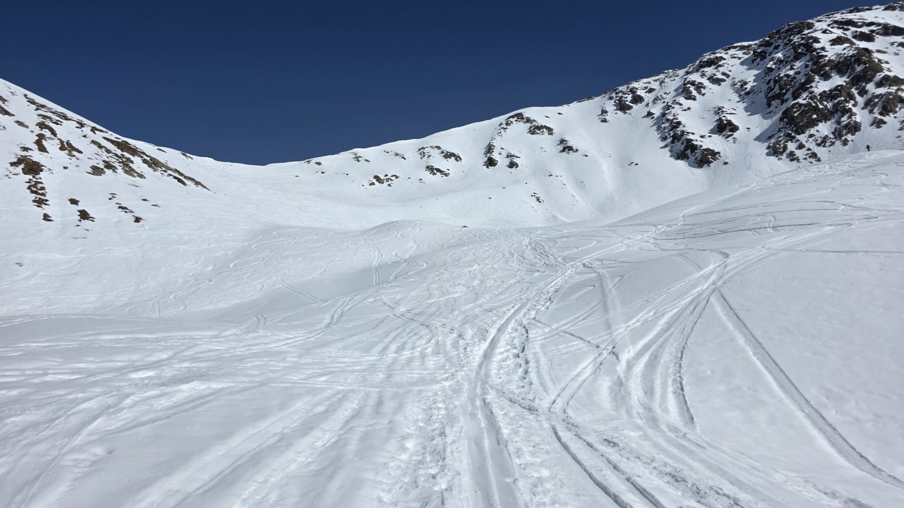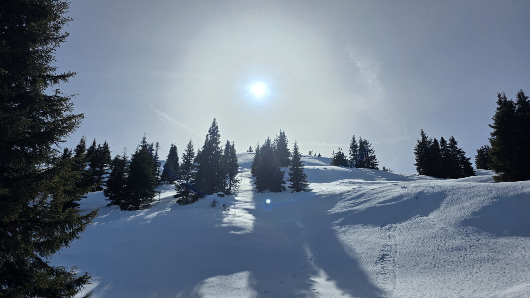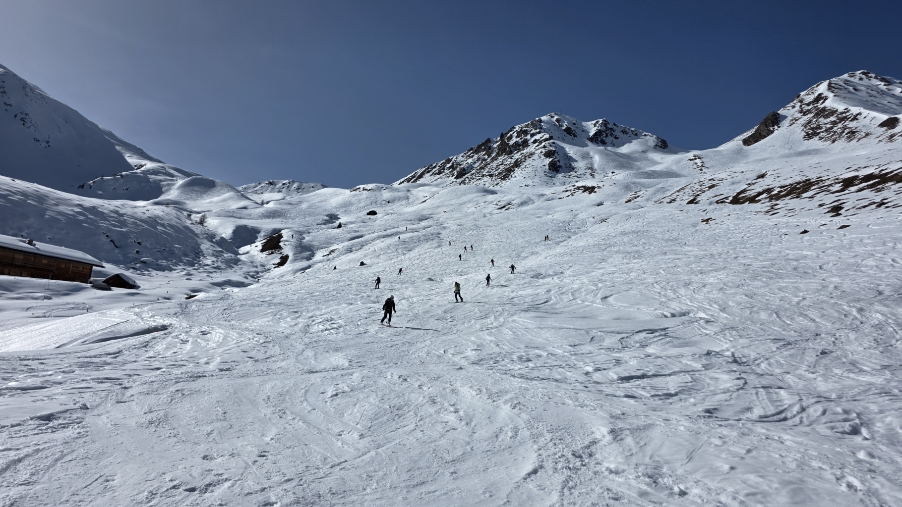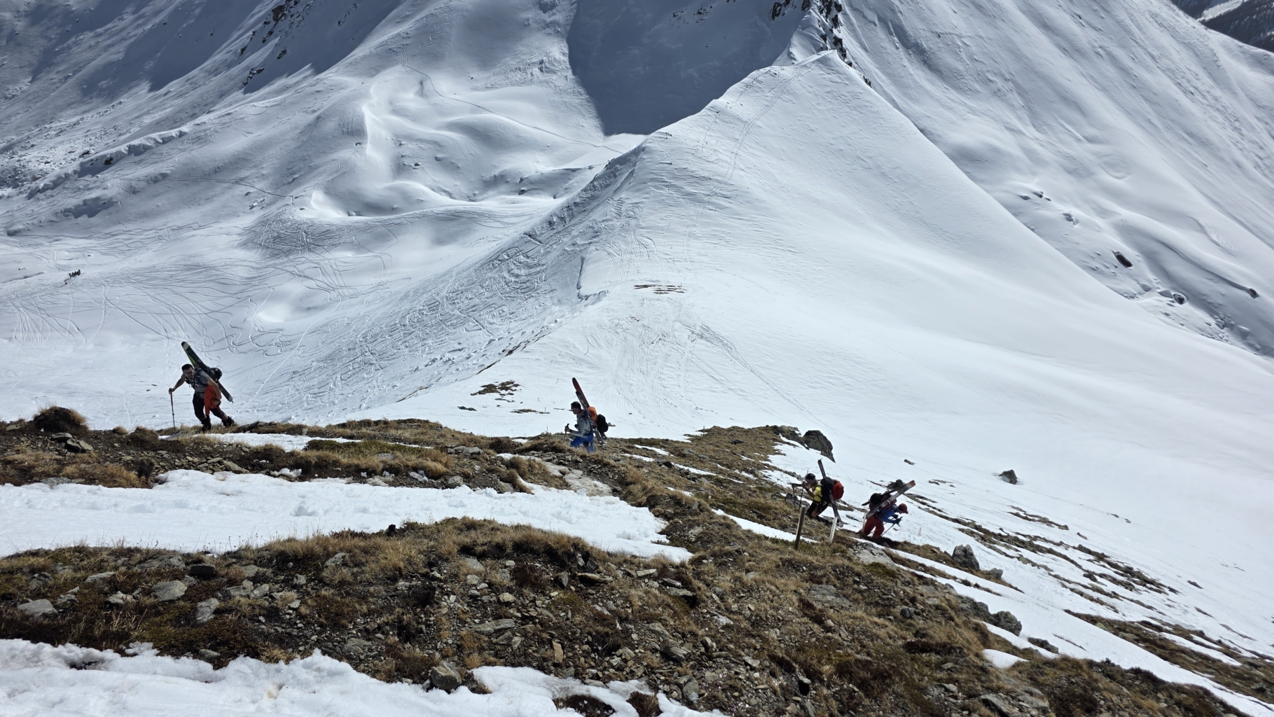 Am letzten Tag führten die beiden Skitourenführer die Gruppe auf das Kalksteiner Jöchl mit 830 Höhenmetern Differenz. Diesmal ging es durch einen anfangs schattigen Taleinschnitt ohne Tragestellen über einen Zustiegsweg bis zur Tschernied Alm auf 1976m. Von dort weiter in östlicher Richtung über einen Rücken und einen eisigen Hang hinauf in das kupierte Gelände bis auf das 2250m hohe Plateau unterhalb des Kalksteiner Jöchls. Der Blick auf die umliegenden Berge und die erreichten Ziele der beiden vorangegangenen Tage waren ein schöner Abschluss.
