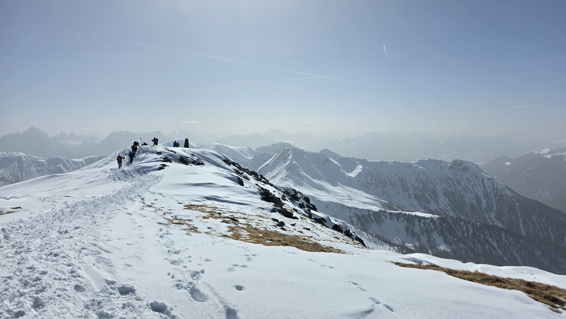 Am zweiten Tag ging es, wieder bei herrlichstem Sonnenschein, direkt vom Hotel aus auf die Skitour auf den 2559 m Hohen Mann. Auf dem ostseitigen Zustiegsweg gab es sonnenbedingt einige kleinere Tragestellen, bevor sich dann das weitläufige, freie und kupierte Gelände eröffnete. Nach Überwindung einer steileren Stufe ging es von der Pfinnscharte erst ein Stück über den steilen Südgrat zu Fuß und dann weiter auf Skier zum Gipfel. Ein grandioses Panorama und die anschließende lange Abfahrt war eine schöne Belohnung für die Skibergsteiger. Skitourenführer Holger Kniep, der von dem erfahrenen Friedemann Scheu unterstützt wurde, zeigte sich sichtlich zufrieden. Die abschließende gemeinsame Vesper auf der Sonnenterrasse des Hotels war der kulinarische Abschluss der Tour.