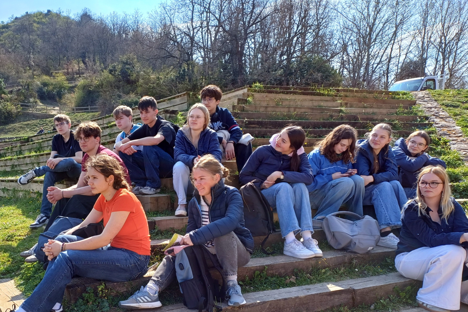 Nach der Ankunft am Samstagabend verbrachten wir alle einen – für Südfrankreich eher unüblich – leicht verregneten Sonntag in unseren Gastfamilien. Pünktlich zum offiziellen Programmstart am Montag besserte sich das Wetter, sodass wir nachmittags bei strahlendem Sonnenschein zur nahegelegenen Burgruine Crussol wandern und die Aussicht über das weite Rhônetal genießen konnten. Zuvor stand jedoch der Schulalltag im Fokus: Nach einer Hospitation im Unterricht besuchten wir eine von französischen Schülern gestaltete Ausstellung zum Elysée-Vertrag, welche die Bedeutung der deutsch-französischen Freundschaft – mit Schwerpunkt auf der lebendigen Freundschaft zwischen Valence und Biberach – anschaulich darstellte.