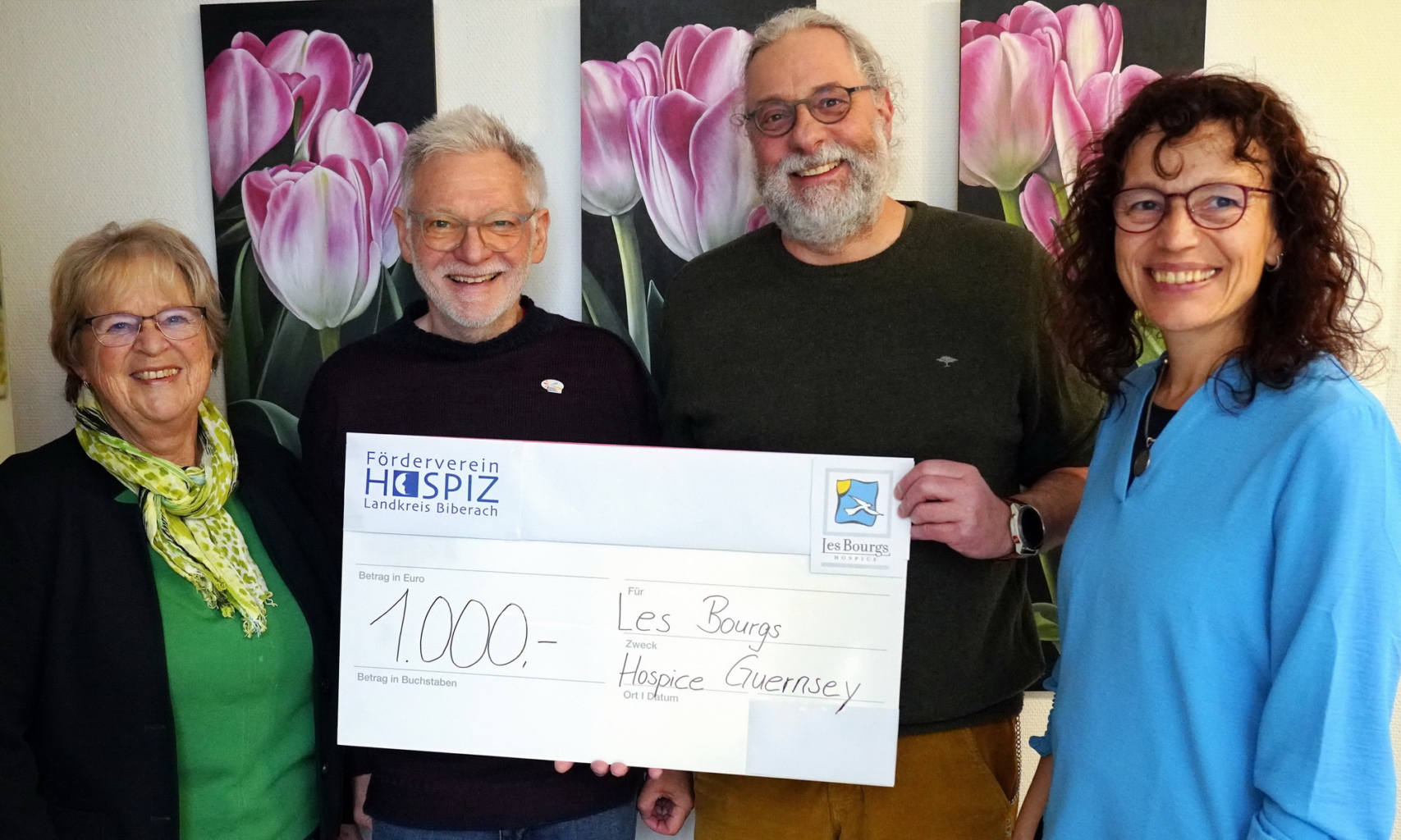 Der Förderverein Hospiz im Landkreis Biberach unterstützt bei uns die ambulante und stationäre Hospizarbeit und Palliativversorgung. Dr. Axel Rieber, Palliativmediziner im Biberacher Hospiz, und Siglinde von Bank, beide Beiräte Förderverein Hospiz Biberach, haben die Spende an Helga Reiser, der Vorsitzenden des Freundeskreis Guernsey und Hans-Bernd Sick, Vorsitzender des Vereins Städte Partner Biberach e.V., übergeben. Bei der Übergabe gaben sie ihrer Hoffnung Ausdruck, dass es in naher Zukunft zu einem Austausch bzw. einer Partnerschaft mit einer Einrichtung im „Mutterland der Hospizbewegung“ geben wird.
